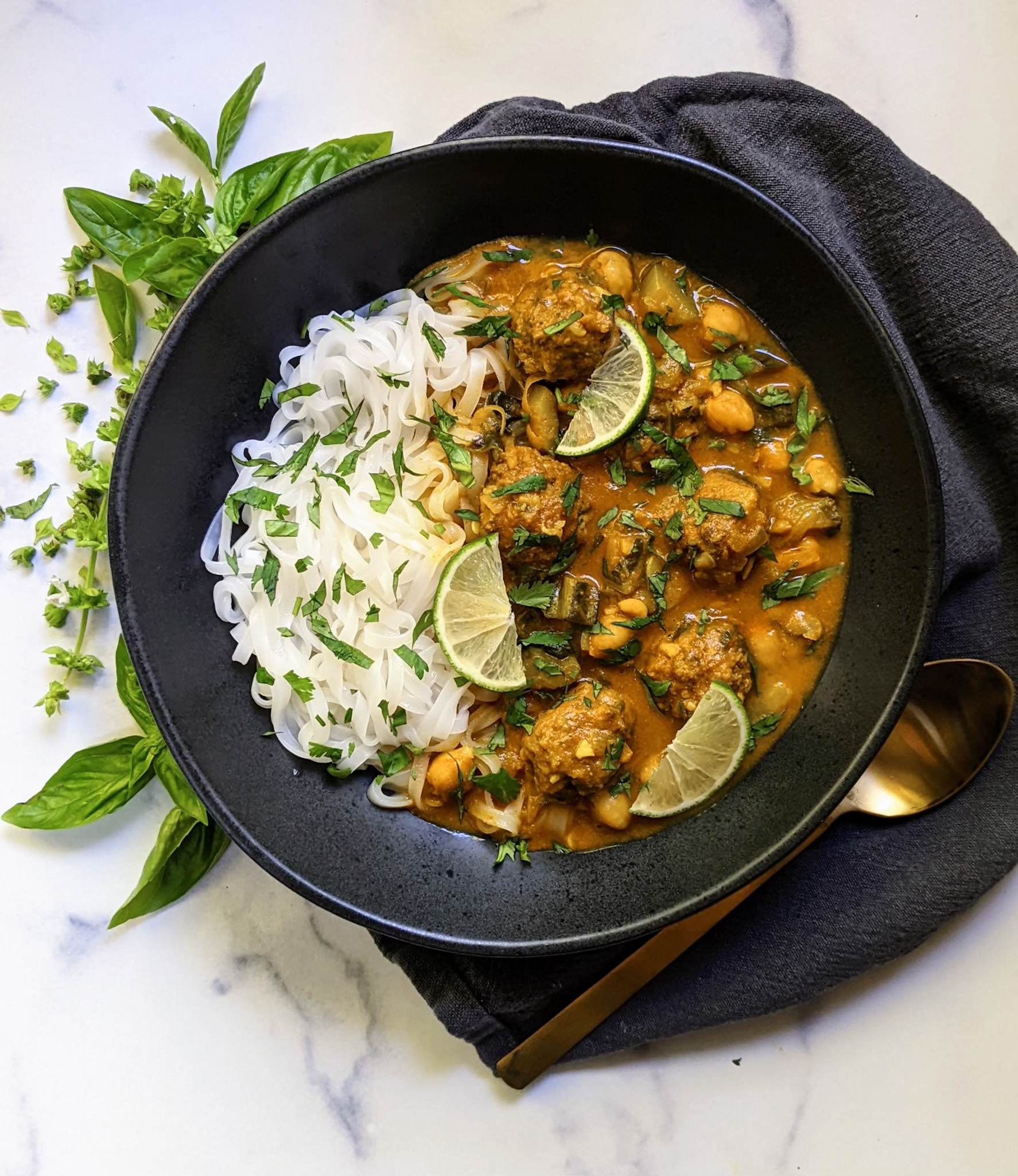 Golden Curry Lamb Meatball Soup is full a bodied bowl of spiced meatballs, vegetables, lime, and a rich coconut curry broth.